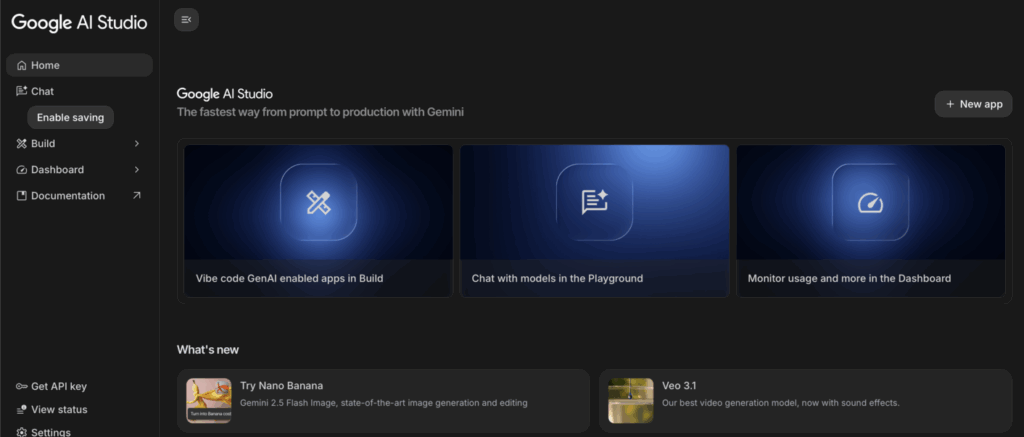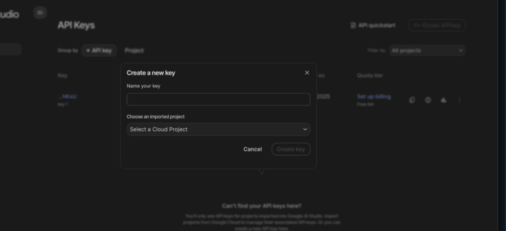 Navigate to Google AI Studio and Click on Get API Key (on the left bottom corner)