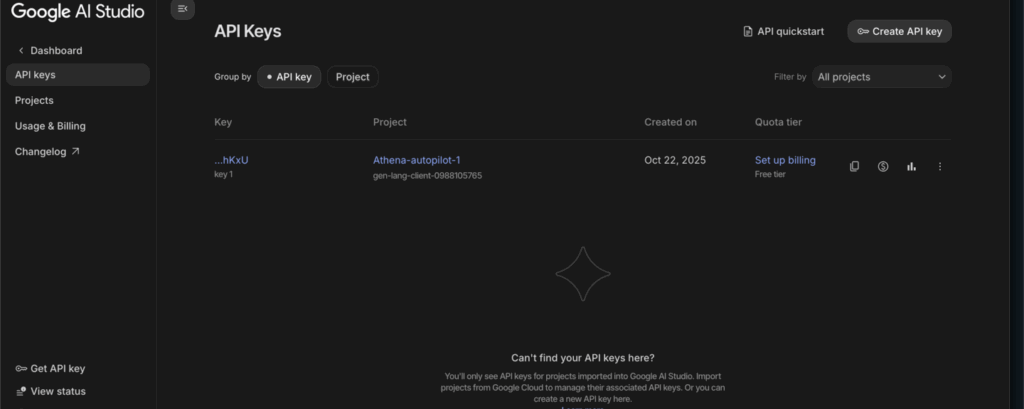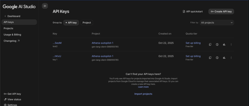 Important: Subscribing to Athena Autopilot gives you access to the service, but it doesn’t give you an API key automatically. If you want to connect Athena to your own apps, scripts, or workflows, you’ll need to generate one yourself.