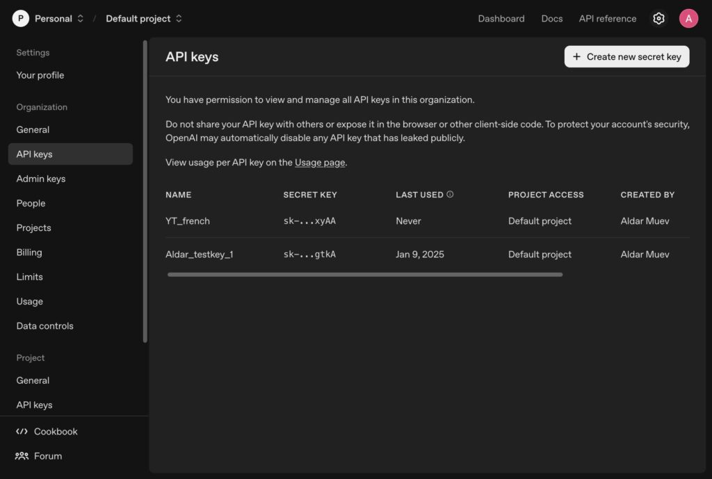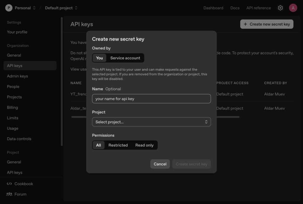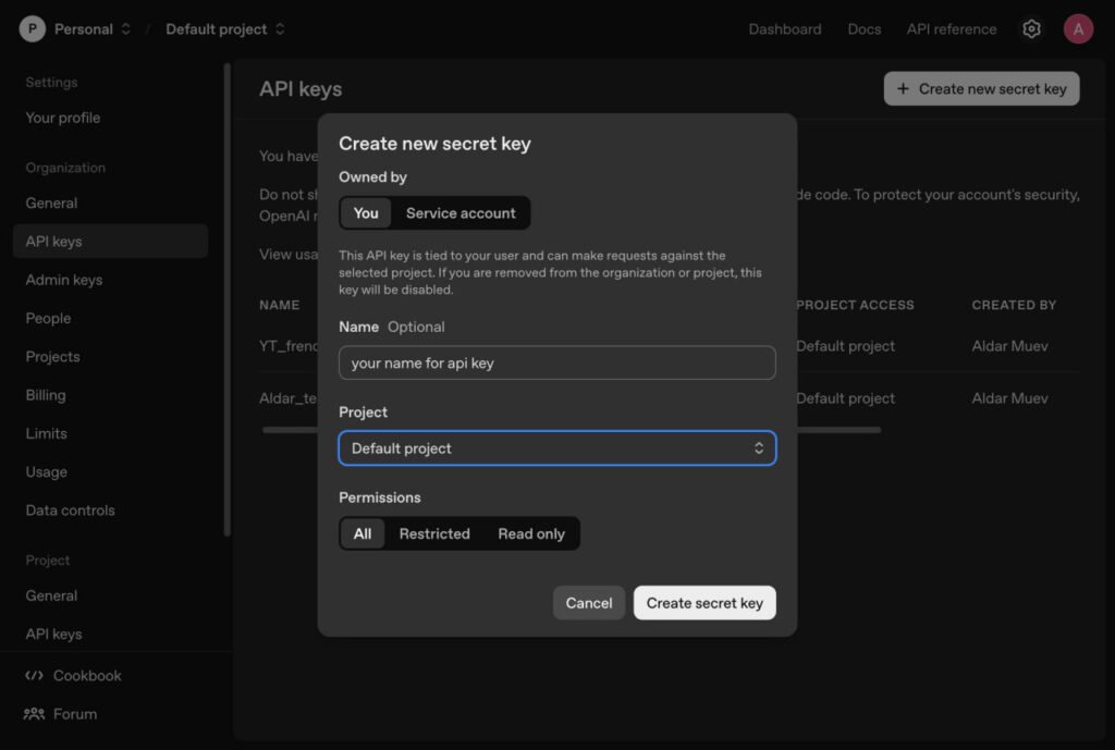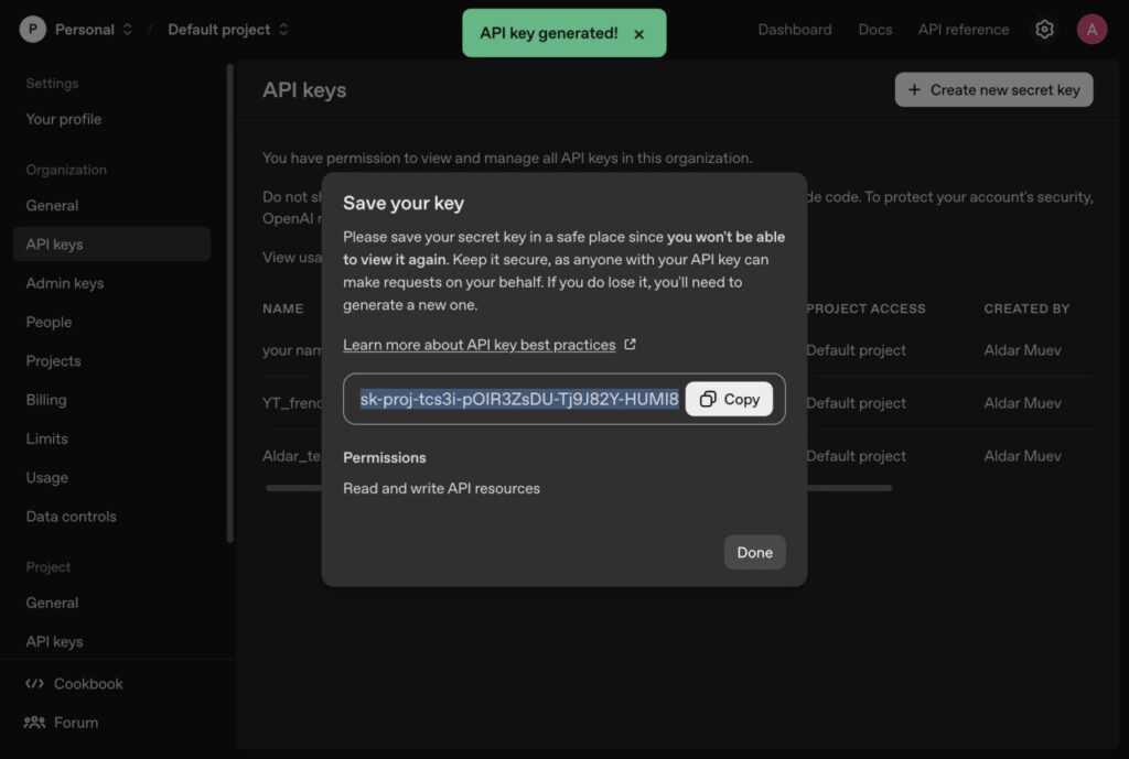 An API key is a secret token that allows your apps to communicate securely with OpenAI. Keep it private—anyone with access to it can use your account.